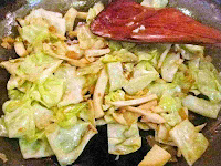 When cabbage is almost done, add the liquid from hydrating shami and soy sauce, and stir.