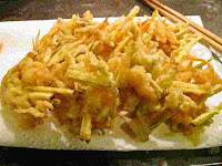 When oil is ready (fine bubbles come up from tips of bamboo chopsticks, or batter quickly sinks and comes to the surface; approx. 350-355 F/175-180 C), scoop vegetables and prawns with chopsticks (to drain excess batter), and gently put in oil.