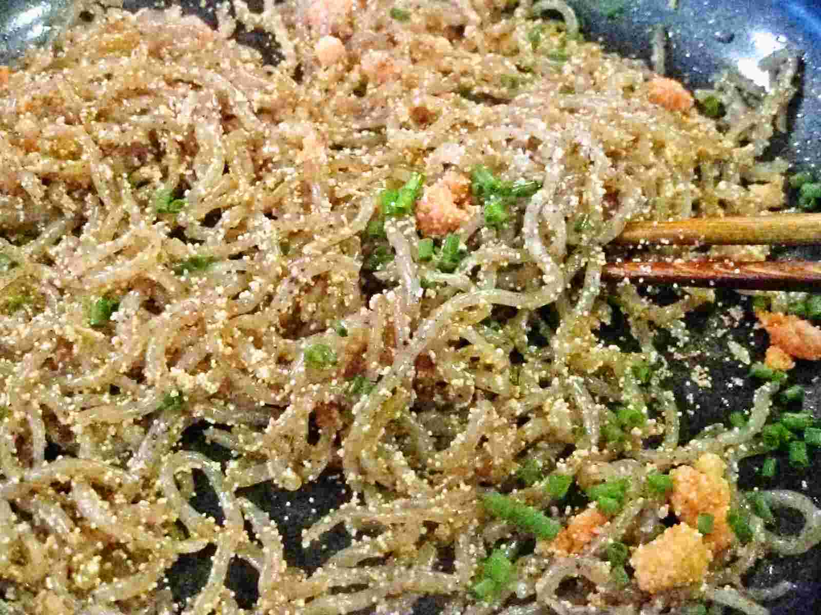In a frying pan, put shirataki, and cook (without oil at first) on medium heat until water is gone.