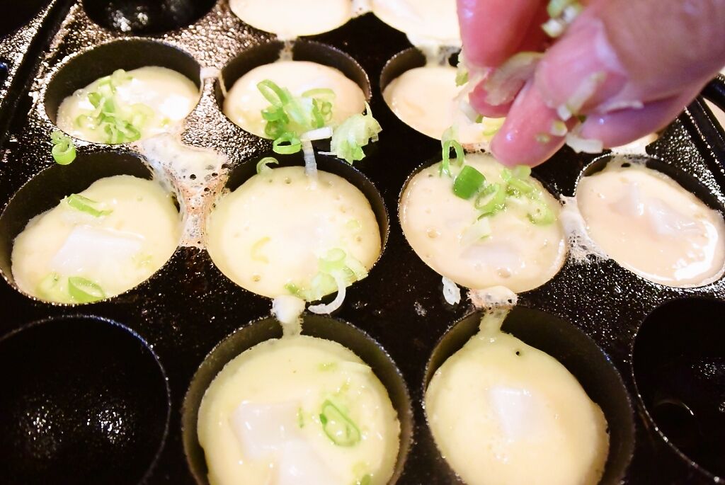 • If using octopus, about the same weight as flour is sufficient. Cut octopus diagonally to obtain part of a sucker with each piece (some crunch when eaten).